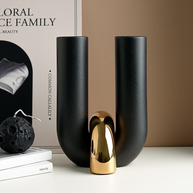 This contemporary vase features twin matte black cylinders connected by a glossy golden arc. Sleek and bold, it adds sophistication to desks, mantels, or shelves. A minimalist showpiece with luxurious flair.